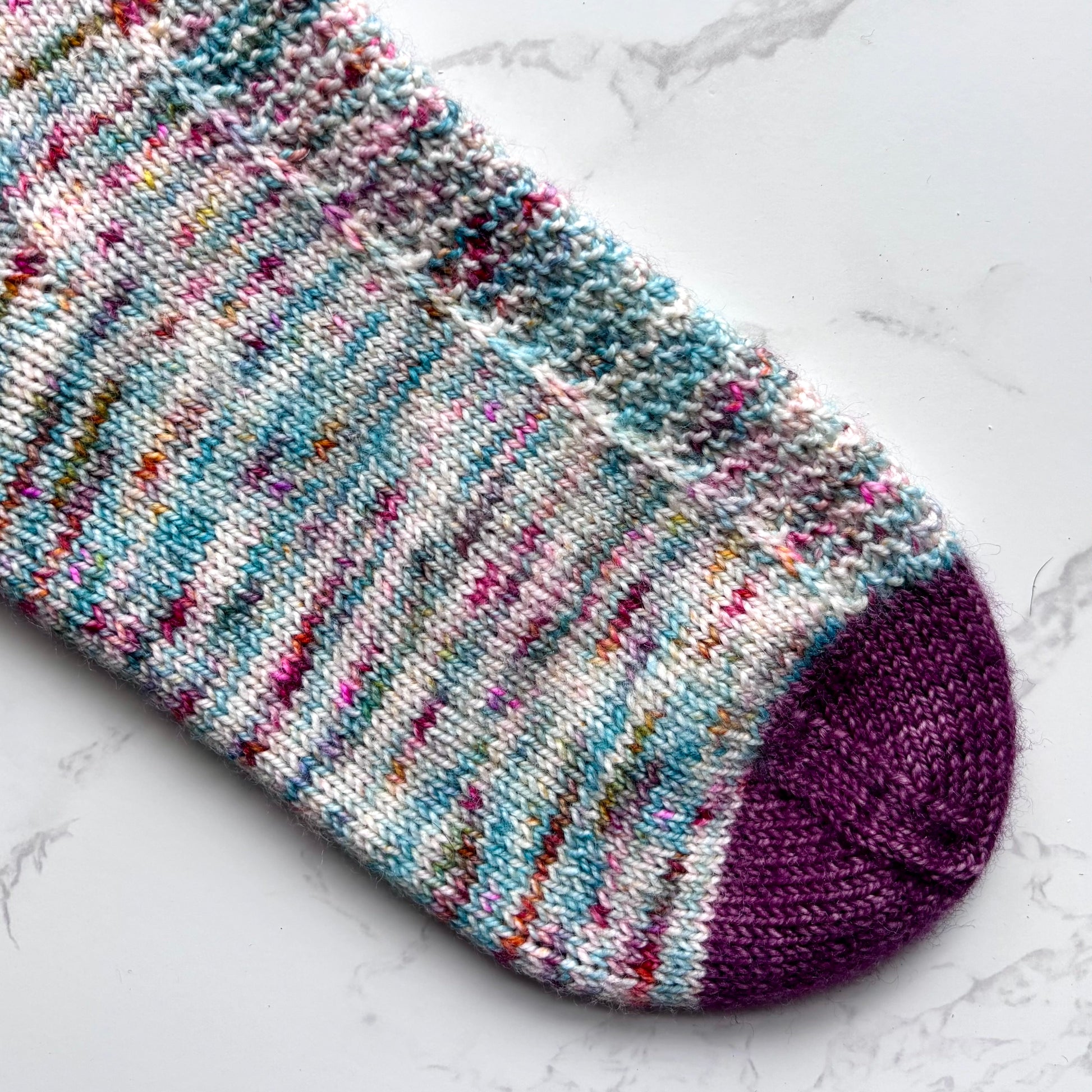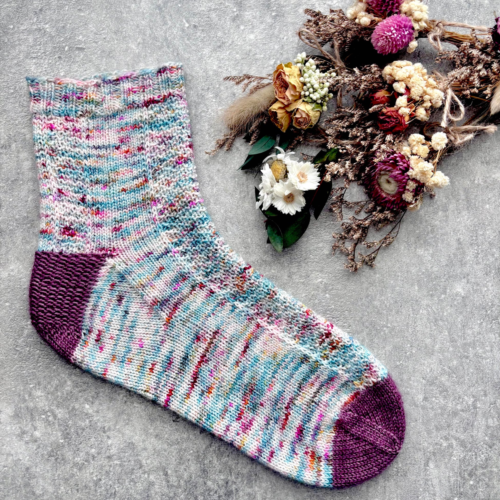 This pattern is written for magic loop and is worked cuff down. It has a 2x2 ribbed cuff, a heel flap and gusset, and a rounded toe. However, you can use any style of small circumference knitting, as well as any cuff/heel/toe combination of your choice.